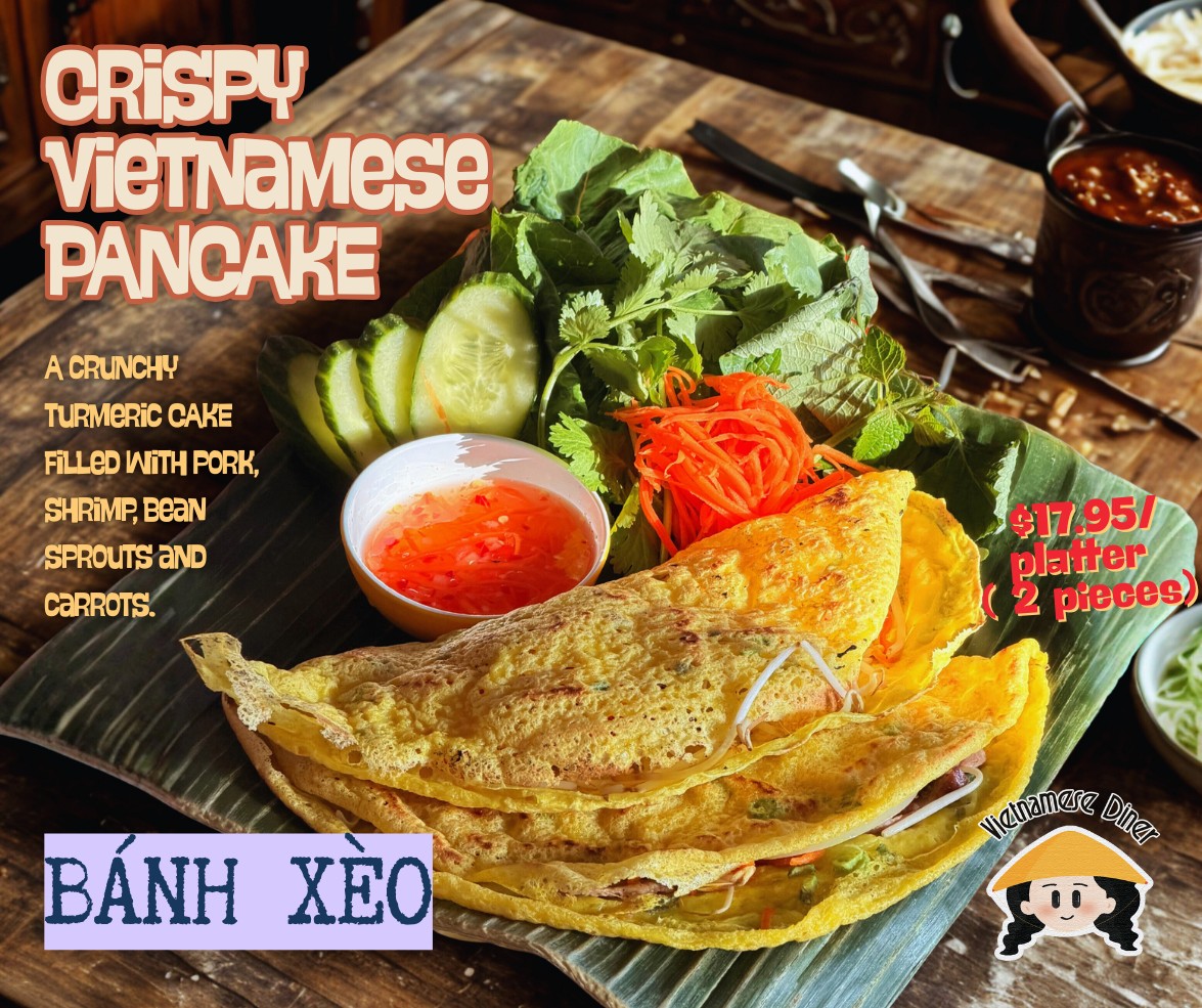 A savory, golden-brown Vietnamese pancake made with rice flour, coconut milk, and turmeric, filled with shrimp, pork, and bean sprouts — served with fresh herbs and our signature fish sauce.