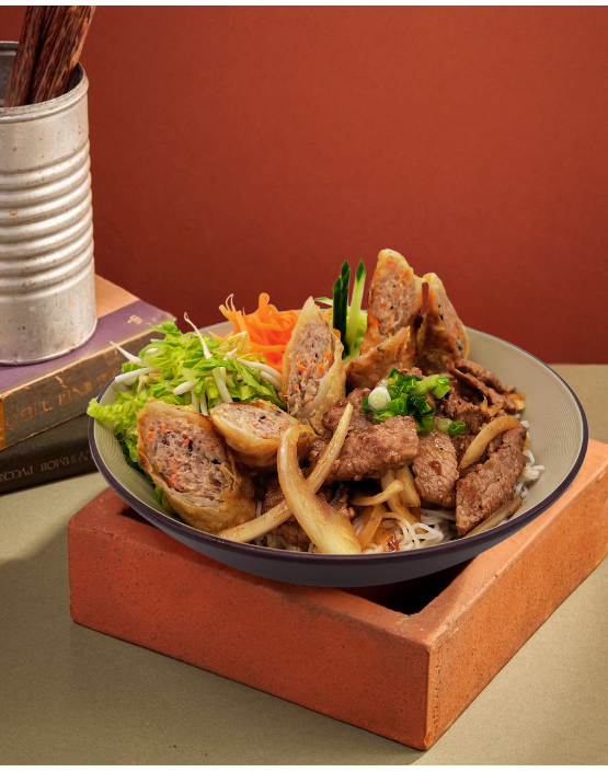Your choice of meat — Chicken, Beef, Shrimp, Pork, or Vietnamese Sausage — served with noodles, fresh veggies, and 2 crispy homemade spring rolls.
