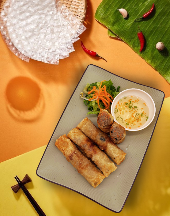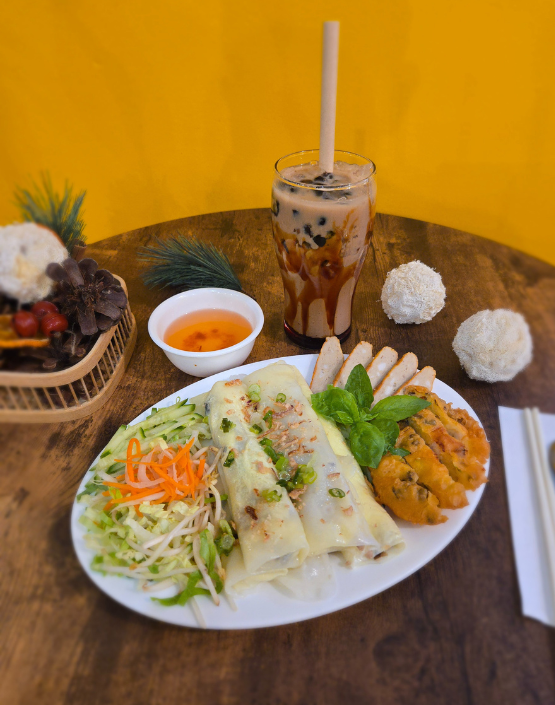 Silky steamed rice rolls filled with savory ground pork and wood ear mushrooms, topped with crispy shallots and served with Vietnamese ham (chả lụa), fresh herbs, and a side of sweet fish sauce. A beloved Northern Vietnamese classic — light, flavorful, and satisfying.